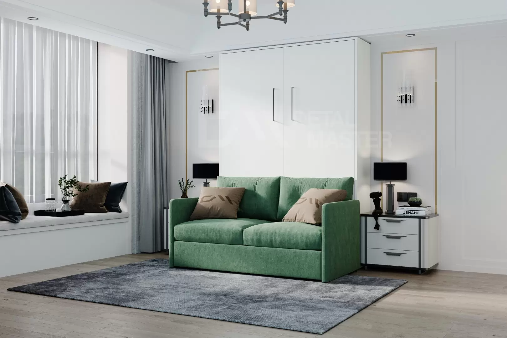 Шкаф-кровать "Simple Start Sofa" работает на механизме раскладывания собственной разработки "Start". Кровать раскладывается легким движением руки, превращаясь в полноценное спальное место. Просто потяните ее за ручки, расположенные на фасаде и выставите ножки-опоры.